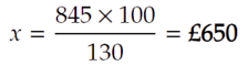 And insert the data: Total = (845 x 100) / 130 = £650.