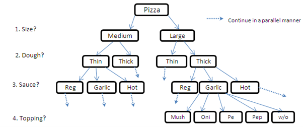 Juliana is not certain which pizza to order. She can have the medium or large-size pizza, with thin or thick dough; replace the regular with hot or garlic sauce; add one topping if she'd like: mushrooms, onions, peppers or pepperoni.